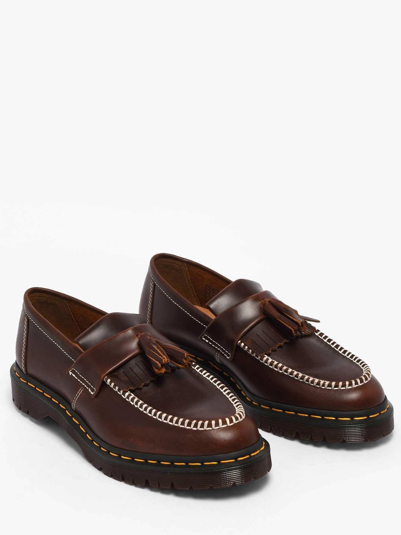 Les mocassins à pampilles Adrian de Dr Martens pour homme en cuir Orleans marron allient élégance et caractère avec la signature emblématique de la marque. Leur cuir profond au fini ciré doux se patine subtilement avec le temps pour révéler un style unique, tandis que les double pampilles, l’empiècement à franges et les surpiqûres contrastantes apportent des détails raffinés qui renforcent l’identité du modèle. La semelle aux crans exagérés, soulignée de surpiqûres jaunes et d’un bord rainuré bicolore, garantit robustesse, confort et reconnaissabilité immédiate. Polyvalents et intemporels, ces mocassins deviennent un incontournable pour traverser la journée avec style, assurance et caractère, tout en affirmant un look moderne, élégant et résolument Dr Martens.